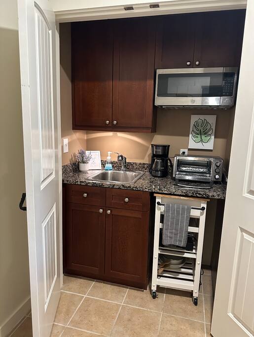 Beautiful 3rd Floor Unit is newly renovated, 1 Bedroom, 1 Bathroom Oversized luxury hotel style studio condo with a kitchenette bar and granite countertops. The master bathroom boasts an oversized powder room vanity and a bathtub. The Kitchenette includes a mini refrigerator, microwave,coffee maker, tea pot, toaster oven, plates and all utensils. INDOOR LIVING: Vaulted ceilings, tile floors, open floor plan, ample natural lighting, flat-screen smart/cable TV KITCHEN: Fully equipped kitchenette (no stove), granite countertops, eat-in bistro bar w/ seating GENERAL: Air conditioning, free WiFi, linens/towels, paper towels, toilet paper. Professionally cleaned before each occupancy. PARKING: Unassigned Community Parking