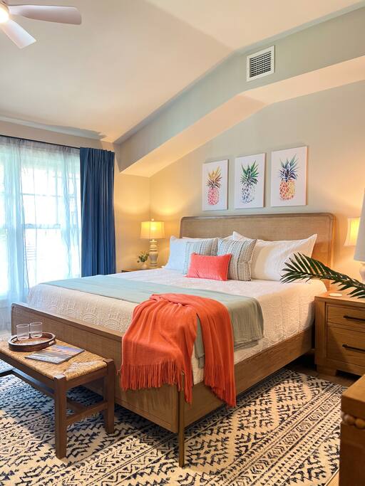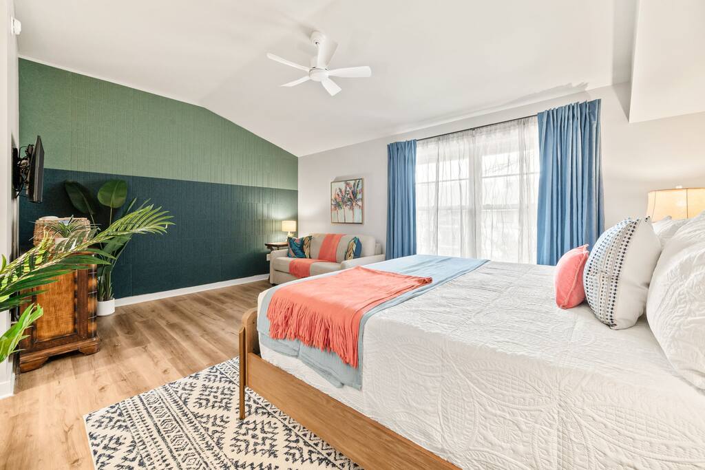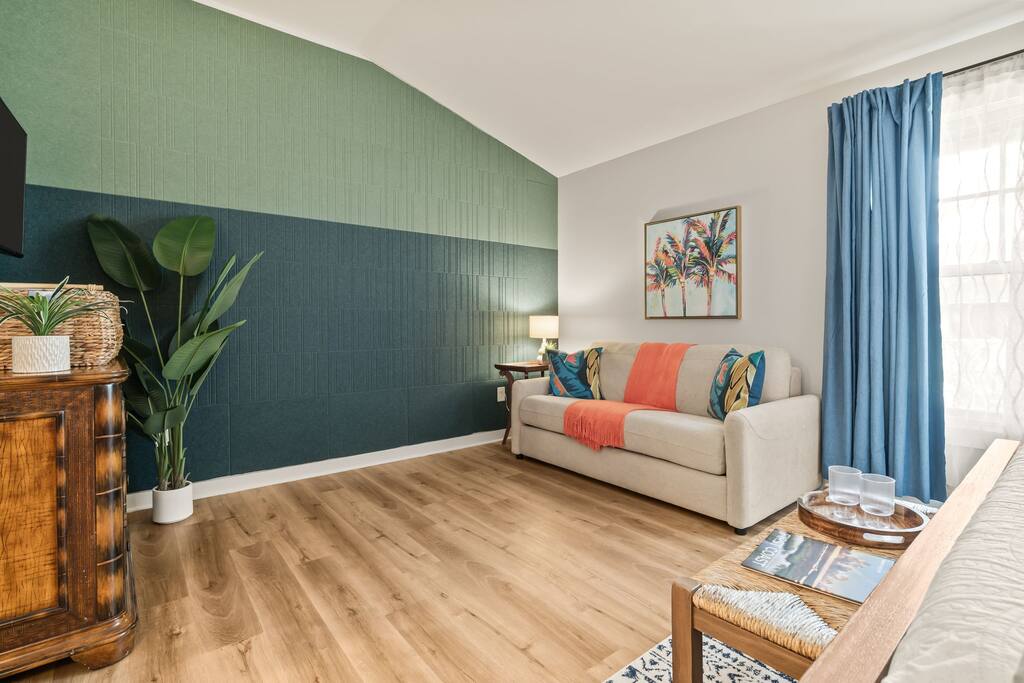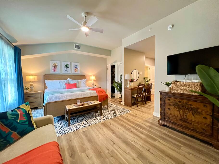 Stay in an immaculate, designer tropical studio within a secure, gated resort community with a 24/7 guard gate. This bright retreat sleeps 4 with a king bed and queen sofa bed (Pack ’n Play available). The open layout includes a fully stocked kitchenette with essentials for easy meals or morning coffee. Natural light and a tropical design create a relaxing vibe, while pool views add to the resort experience. In-Unit Washer/Dryer Combo – perfect for longer stays; travel light and stay fresh. 🏝 Resort Amenities · 3 Sparkling pools (resort-style pool, Olympic & zero-entry) · On-site pickleball courts and nearby King & Bear Golf Course · Clubhouse & tropical walking paths · Pet-friendly community for your four-legged companions · Secure, gated community with 24/7 guard gate 🌆 Location Highlights Just 30 minutes to Historic St. Augustine, where you can explore cobblestone streets, Spanish architecture, vibrant dining, and sandy beaches. The perfect balance of history, relaxation, and adventure. 🌞 Perfect For Ideal for couples, solo travelers, small families or pet-friendly escapes, this studio offers comfort, convenience, and all the perks of a resort stay.