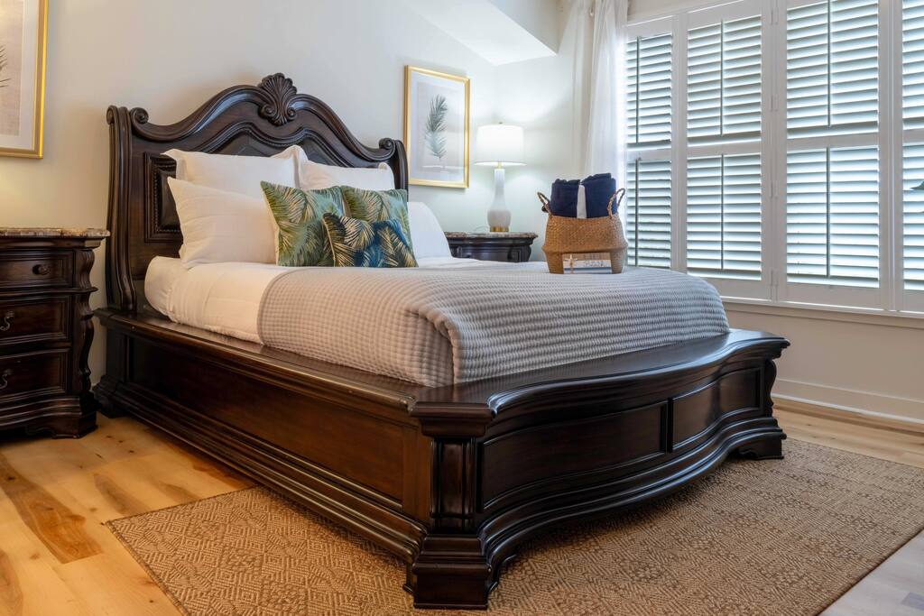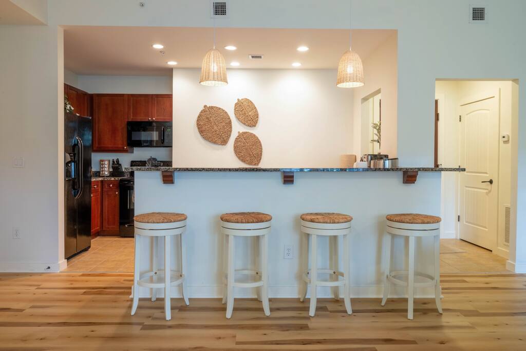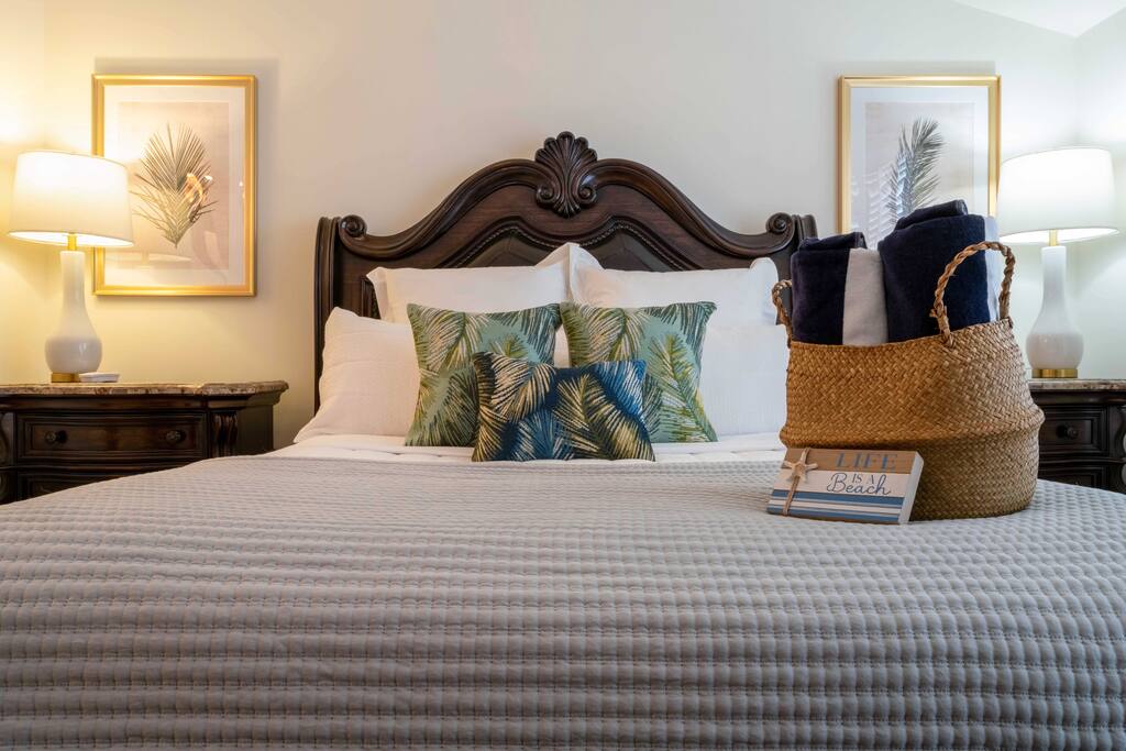 Beautiful 3rd Floor Unit is newly renovated, 1 Bedroom, 1 Bathroom Oversized luxury condo with a full kitchen, granite countertops, 4 seat bar sitting area, 4 seat dining room, beautiful sofa with two super comfortable oversized chairs. The master bathroom boats double sinks and a large tub. The gourmet Kitchen includes a refrigerator, microwave, Keurig coffee maker, teapot, French press, toaster oven, air fryer, plates, pots and pans and all utensils. Also included is a washer and dryer. The condo has access to 3 gorgeous pools, hot tub, fitness center, tennis courts, & spa all within a half mile. 7 Miles of stunningly maintained walking paths. Enjoy the charming, private community with a 24 hour gate guard. The beautiful King and Bear clubhouse has full kitchen, dining room and bar within walking distance. Professionally cleaned before each occupancy. Easy self check-in with lockbox RESORT AMENITIES: Outdoor pool, hot tub, spa, 2 world-class golf courses (available for an additional fee), brand new fitness center INDOOR LIVING: Spacious Condo, tile floors, open floor plan, ample natural lighting, flat-screen smart/cable TVs (1 in living room & 1 in bedroom) KITCHEN: Fully equipped, granite countertops, all essential appliances, eat-in bar w/ seating Working from home!? The space is equipped with High Speed (500 mb) WiFi! Relax and watch a movie on 50 inch high definition Roku smart TV with cable and TV streaming applications in the living room or the 40 inch Roku TV in the bedroom. GENERAL: Air conditioning, in-unit laundry, free WiFi, linens/towels, paper towels, toilet paper and toiletries. Professionally cleaned prior to each occupancy PARKING: Unassigned Community Parking Amenities Our condo is in a beautiful gated golf community with lots of walking paths. Everyone has been very welcoming and friendly here. Our condo complex has its own pool, which is about a 1-2 minute walk away. About a half mile down the road is the amenity center that has 2 more pools, tennis courts, gym, Full Spa, and patio area. In regards to the surrounding area, there are a handful of restaurants right outside the gate (2 Creeks, Brucci’s, Gators Dockside, Tank’s Sushi Bistro, and Cinco de Mayo. There are also other pizza places, and Chinese food. Within the World Golf Village there there is a clubhouse that serves breakfast and lunch, and dinner on Fridays. There is also the Murray Bros Caddyshack restaurant and the World Golf Hall of Fame. We are 15 minutes from the St Augustine outlets. 30 minutes to the downtown St Augustine area where there is a lot of restaurants and shops. We are also 30 minutes from beaches. Names for Gate Guard Thank you for booking with us! We have an easy self check in with a lockbox. We will message you the day prior to your arrival with the lockbox code. The World Golf Village has a gate guard 24/7 that requires one person in the vehicle to provide photo identification at the time of arrival, in order to enter into the community. At your convenience, can you please let me know if you would like me to add any other names, besides yours, to the guest list? If you have any questions at all in the meantime, please don’t hesitate to reach out! We are happy to help ensure you have a wonderful trip!